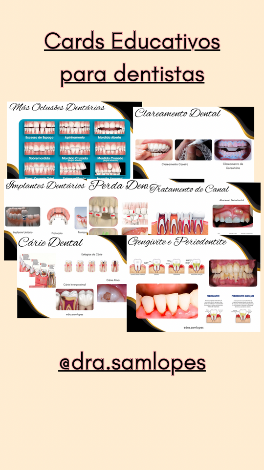 São 12 Cards Educativos Odontológicos sobre procedimentos do dia a dia clínico dos Cirurgiões-Dentistas. São eles: